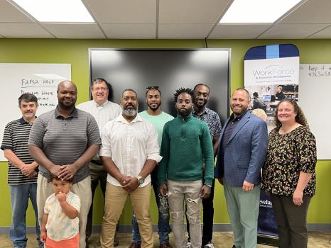 Pictured, front row, left to right: Kenneth Peoples, Jeffrey Thompson, Brian Armstrong, Cleveland State HVAC Instructor Jason Taylor and Cleveland State Director of Workforce Development Heather Brown. Pictured, back row, left to right: City Fields Economic Development Coordinator Brian Stewart, Cleveland State Interim Vice President of Workforce Development, Institutional Research and Advancement Dr. John Squires, Marcus Davis and Fritzgerald Leroy.